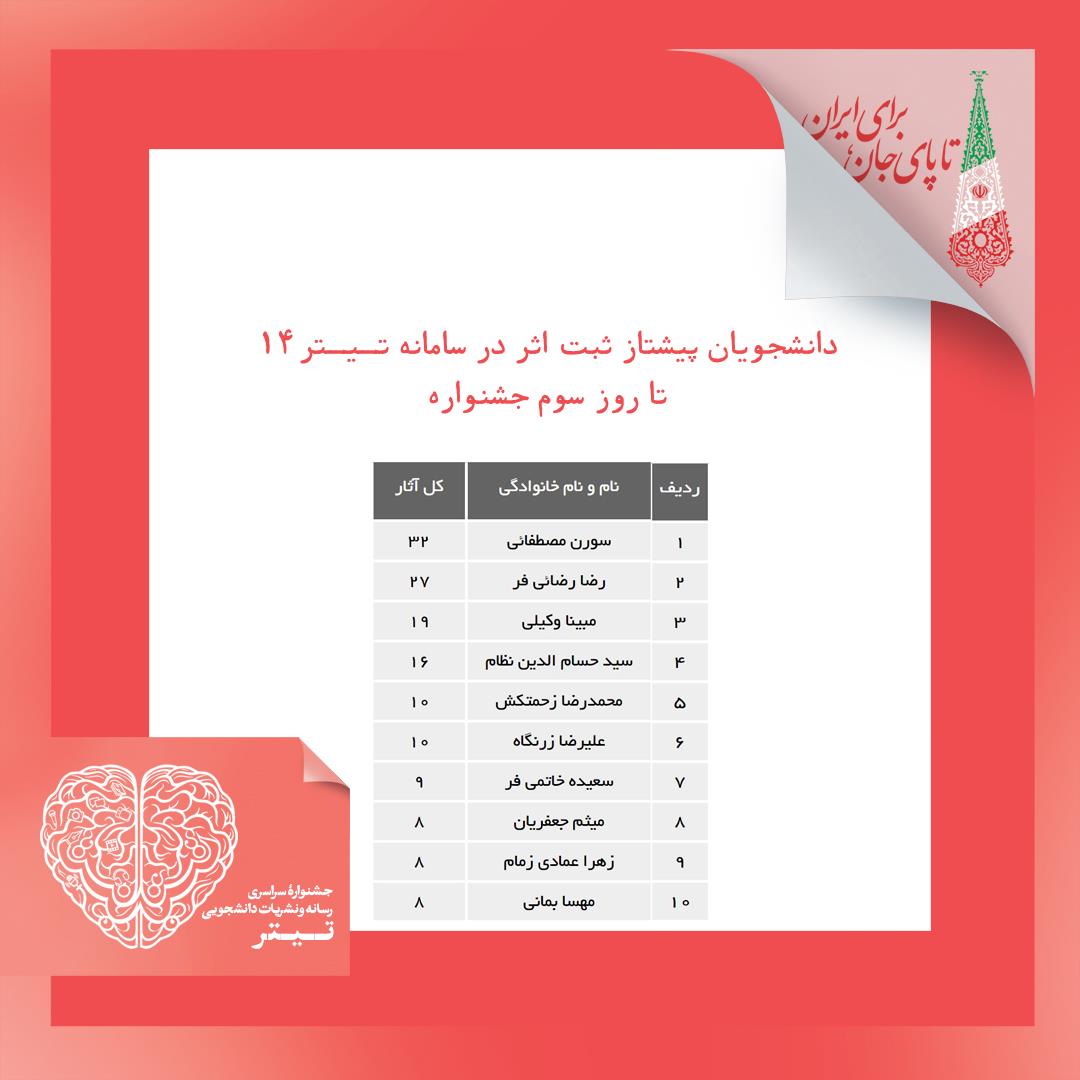 به گزارش دبیرخانه جشنواره تیتر 14، تا عصر روز سوم شروع فرآیند ارسال آثار به این دبیرخانه، تعداد 224 اثر در سامانه دریافت شد که آقایان سورن مصطفائی از دانشگاه خوارزمی، رضا رضائی فر از دانشگاه زابل و خانم مبینا وکیلی از دانشگاه علوم پزشکی ساوه بیشترین ارسال کنندگان اثر به دبیرخانه جشنواره تیتر14 بودند.